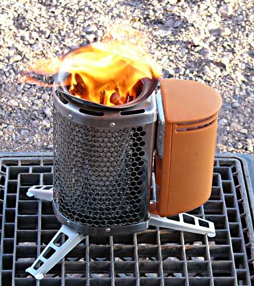 Oh yeah. This is about as high-tech as cooking on wood gets. It uses forced ventilation for efficient burning, reduced emissions, and a really hot flame. And while there are other fan-driven wood camping stoves on the market, they all require batteries to run the fan, and that means batteries to remember and replace. The BioLite uses thermoelectric technology – the heat from the fire is converted to electricity to power the fan. Not only that, but it generates more electricity than it needs for its fan, and makes the surplus available via a USB jack so you can charge your phone, LED light, or other gadgets. Pretty neat, huh?